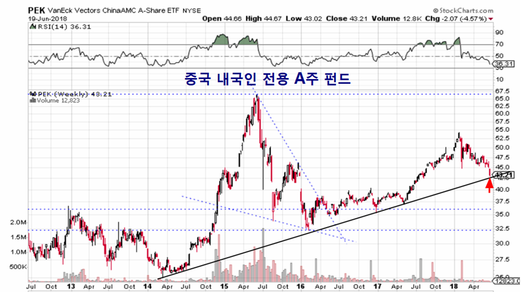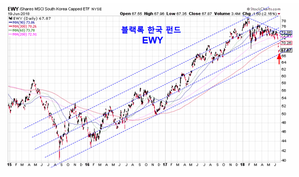 아울러 중국의 하락과 함께 이상 급락을 거쳤던 블랙록이 운용하는 한국펀드 EWY도 2016년 상승 추세가 시작된 이후의 상승 추세를 감싸는 채널의 최하단에 이르면서 하락의 클라이막스에 이른 듯 하다.