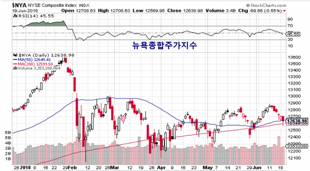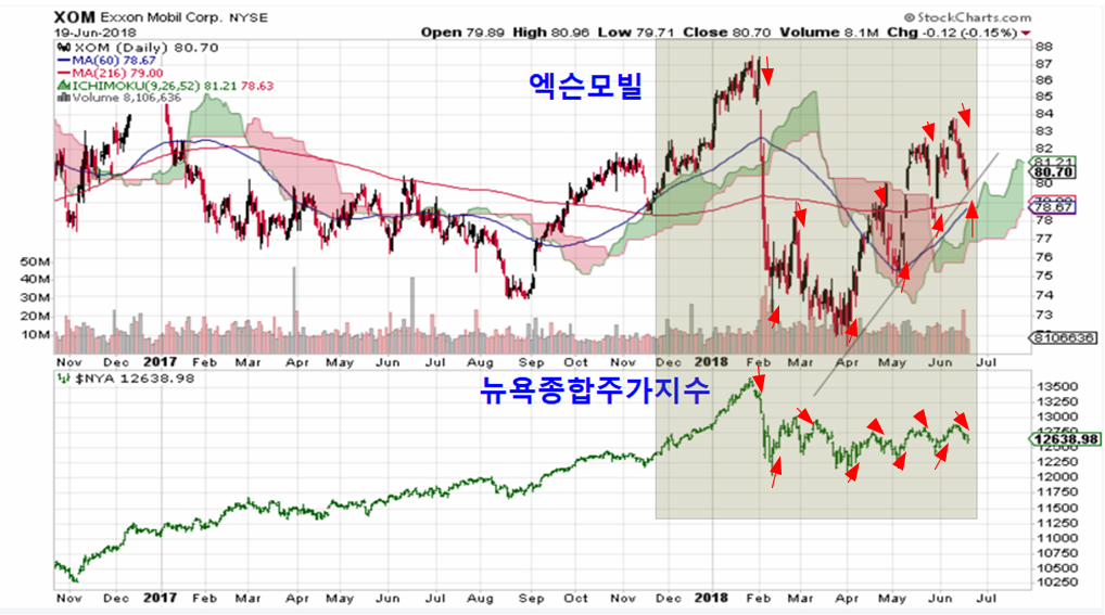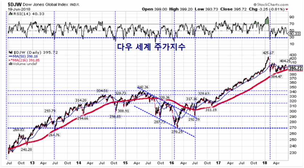 이런 구도 속에 다우세계 지수는 엑슨모빌의 특이한 등락을 따라 조정을 거치며 지지권에 진입하여 있다.