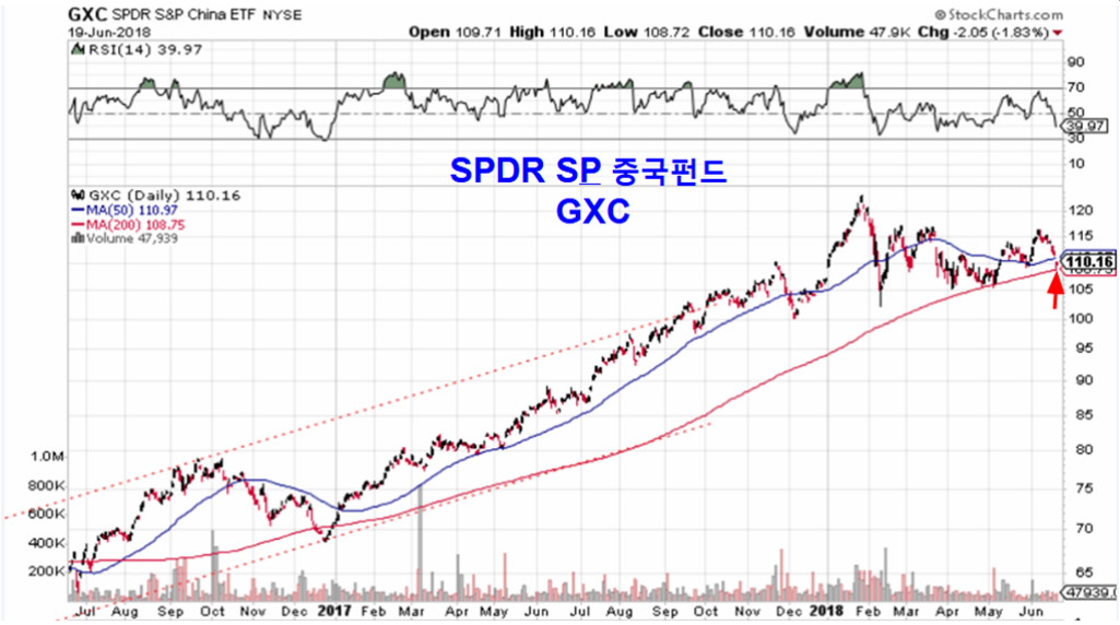 VanEck Vector 자산운용사에서 운용하는 중국 A주 펀드인 PEK는 2014년 이후의 저점에 접하면서 매수권이 되어 있고, 중국 펀드 중 2016년 이후 상승률이 가장 앞섰던 SPDR S&P 중국 펀드 GXC도 200일 평균에 접하면서 매수권이 된 듯 하다.