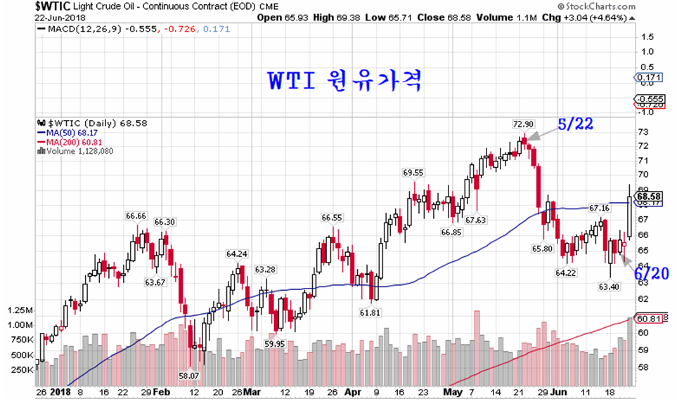 산유국들 회의를 앞두고 과도한 증산을 우려하여 하락했던 원유가격은 산유국의 100만 배럴 증산 결정과 함께 4.64% 상승 마감하였다. 22일 WTI 서부텍사스산 원유가격은 65.93$로 출발한 후 장중 69.38$까지 상승한 후 전일 종가보다 3.04$ 오른 68.58$에 마감하였다.