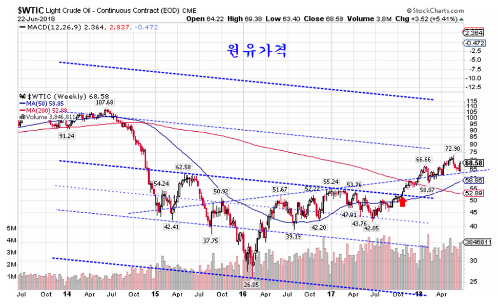 주간으로는 5월 21일 배럴당 72.9$까지 올랐던 원유가격이 4주에 걸쳐 하락이 이어져 배럴당 63.40$까지 13%가 하락한 후 6월 셋째주 저점으로부터 8.17%가 오르며 하락을 회복했다.