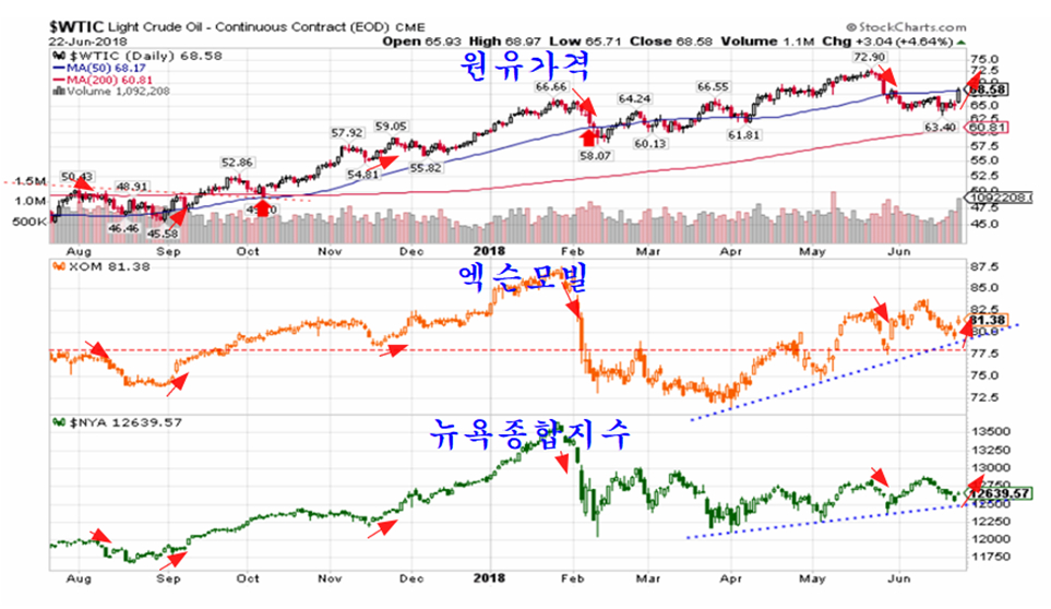 지난해 8월 이후 유가, 엑슨모빌 주가, 뉴욕종합주가지수의 등락을 비교해 보면 원유가격 등락은 엑슨모빌 주가의 등락을 거쳐 뉴욕 종합주가지수에 밀접한 영향을 미치고 있음을 알 수 있다. 특히 주가의 예기치 않은 큰 조정은 대개 유가의 하락과 함께 하고 있다.