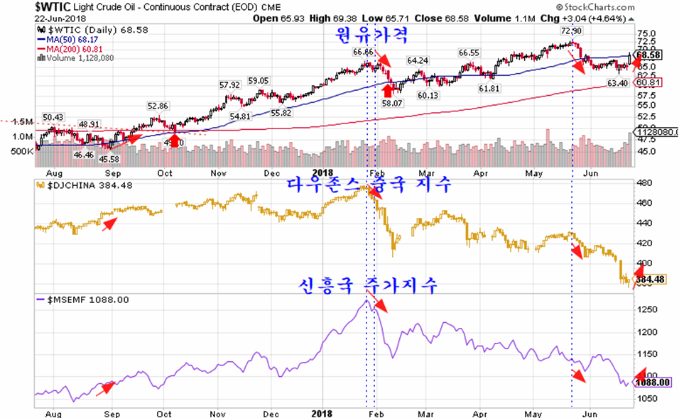 중국 상해종합주가지수는 2018년 1월 말까지 유가가 상승하는 기간 동안에는 비교적 안정적인 상승 추세가 진행되었지만, 1월 유가의 급락과 함께 2월 파생상품 만기 전 급락을 나타냈다.