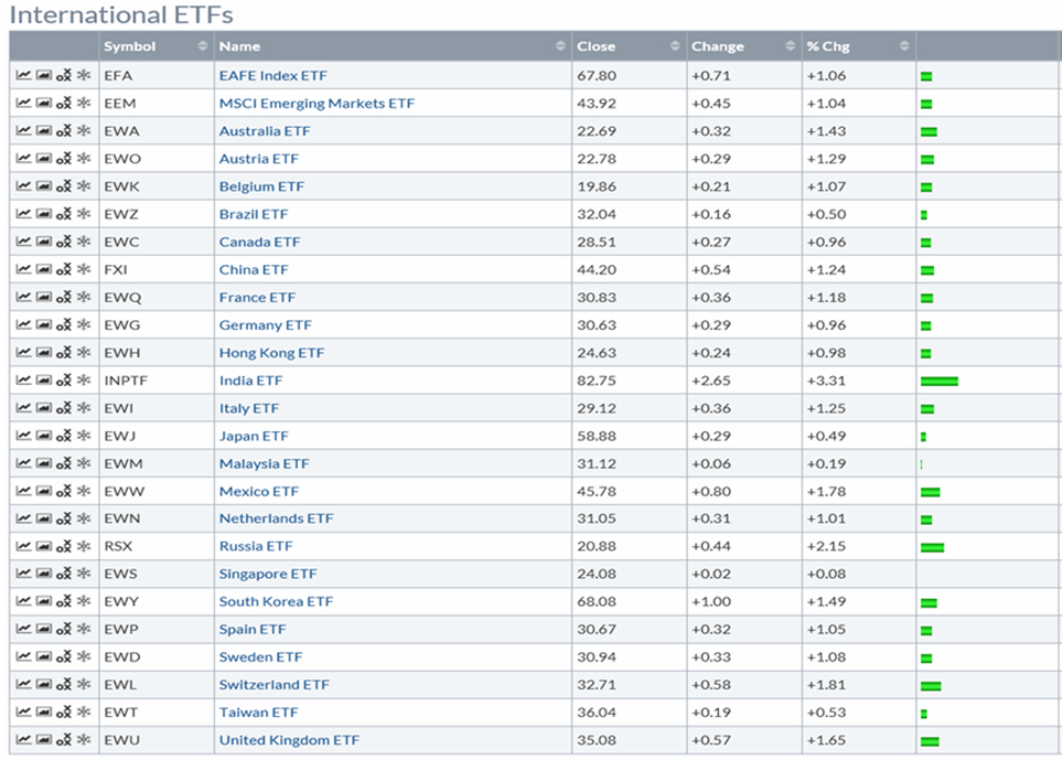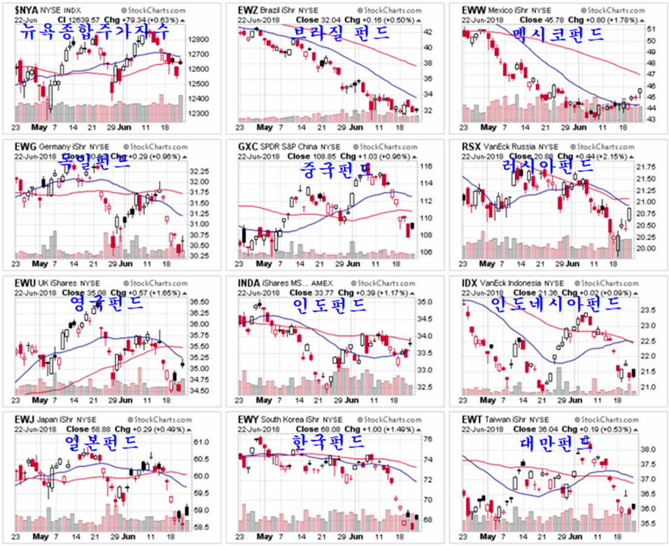 지는 금요일 뉴욕시장의 세계 각국 인덱스 펀드는 일제히 상승하고 있다. 유럽의 주요국 인덱스 펀드와 함께 그간 하락이 이어졌던