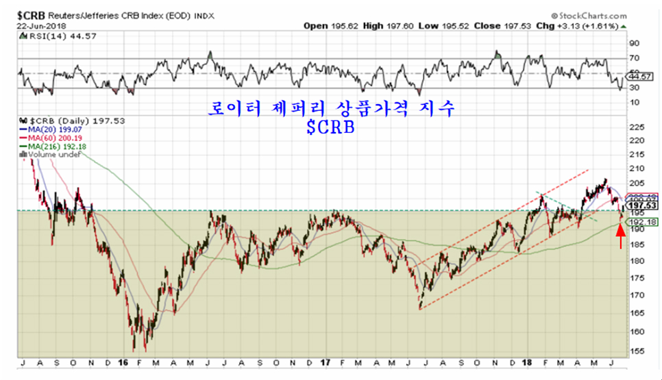 로이터제퍼리 상품가격 지수 $CRB는 195$이 2016년과 2017년 고점을 저항으로 작용했기 때문에 기술적으로 지지가 강한 가격대이다. 5월 원유선물 만기 후 원유가격과 함께 상품지수가 다소 과도한 하락이 이어져 일시적으로 195$를 이탈했지만 금요일 유가 급등과 함께 이 지수도 1.61% 상승하면서 지지선 위로 올라선 모습이다.