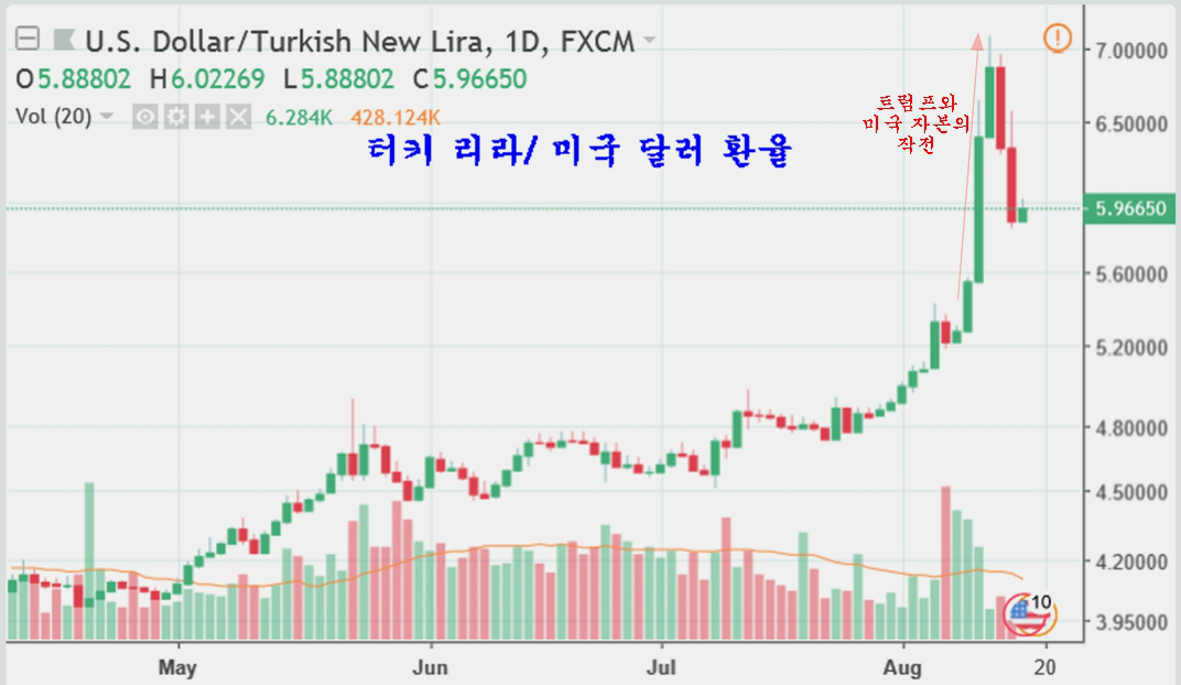 며칠 전 미국은 터키 리라화를 공격하며, 한편으로 거래 규모가 크지 않은 터키의 철강과 알미늄 관세를 두 배로 올려 터키발 외환위기가