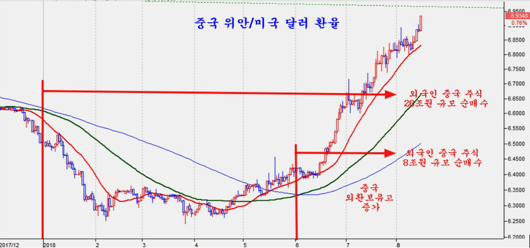 그러나, 중국 증시가 조정을 보인 올 7월까지 외국인은 중국 주식 26조원 규모를 순매수했다고 한다. 그 결과 6월과 7월에 걸쳐 중국 위안화 환율이 급등했지만 7월 중국 외환보유고는 오히려 상당폭 증가를 나타냈다. 즉, 외국자본이 중국을 빠져나간 것이 아니라 외국 투자자금이 중국으로 유입되었다.