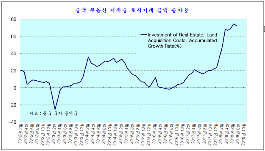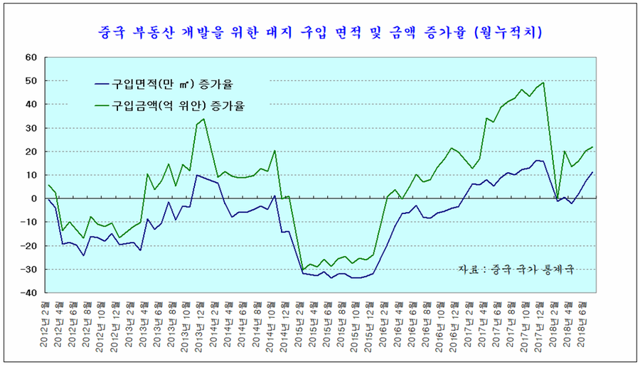 건축을 위한 대지의 구입 면적과 금액의 추이를 보면 2016년 이후 작년 말까지 대지 구입 면적과 금액이 견실한 증가를 보여왔다. 그러나, 2018년 들어 기업 부채조정을 유도하기 위해 시중 유동성 공급을 줄이면서 2분기 중반까지, 건축을 위한 대지 구입이 급격히 줄었으나 2분기 이후 유동성을 늘리면서 회복이 이어지고 있다. 1~7월 대지 구입면적은 전년비 11.3%, 대지 구입 금액은 21.9% 증가를 나타낸다.