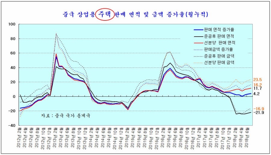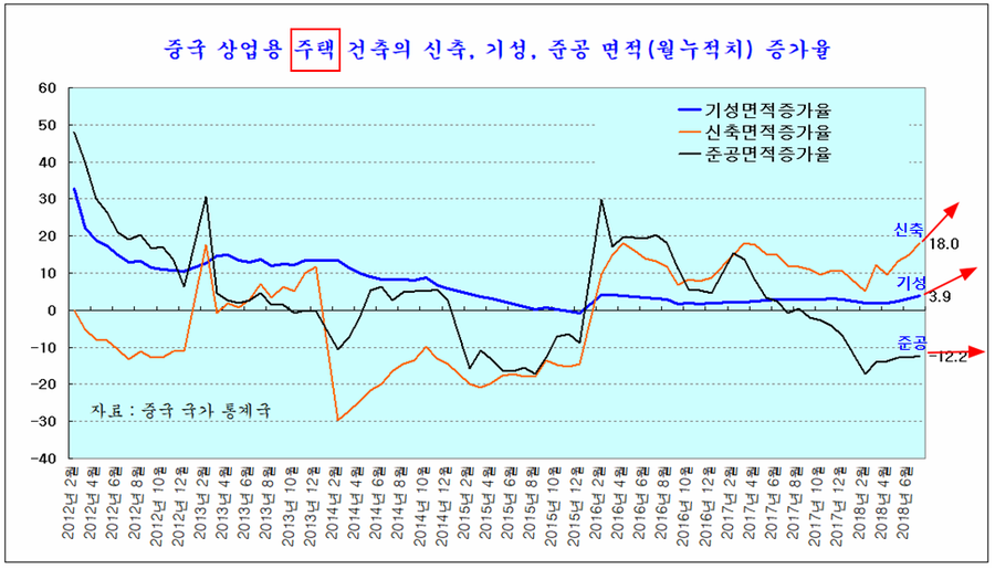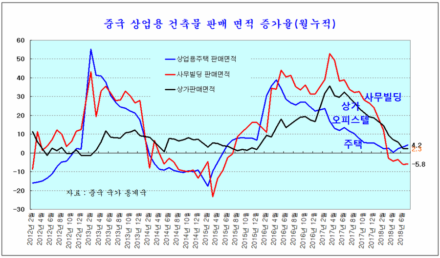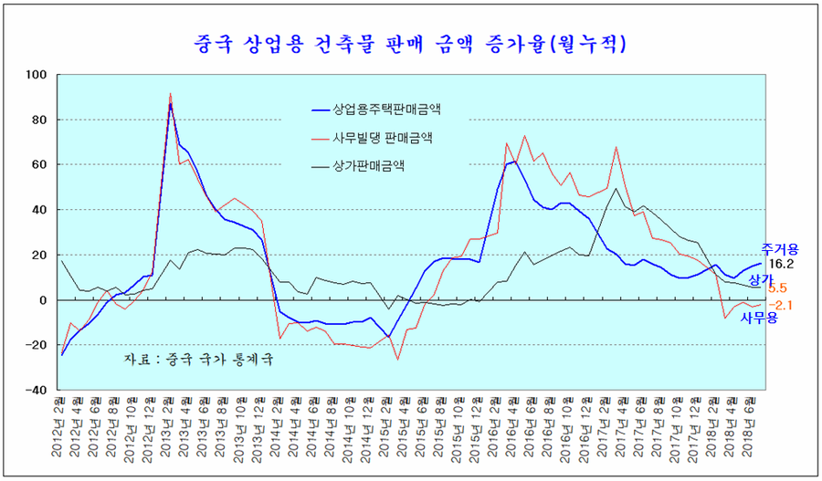특히 상업용 주택, 사무실, 상가로 구성되는 부동산 시장은 상업용 사무빌딩이나 상가 건물의 판매나 건설에서 둔화 내지 침체가 이어지고 있지만, 주거용 빌딩은 2016년 이후 빠른 회복이 이어지고 있는 가운데 2018년 1~7월 누적 투자금액 증가율은 14.2%은 높은 성장을 보이고 있다.