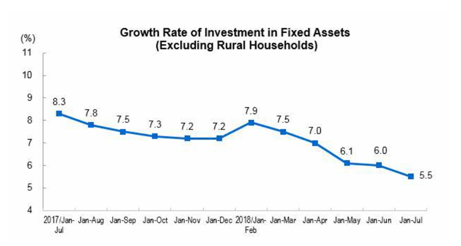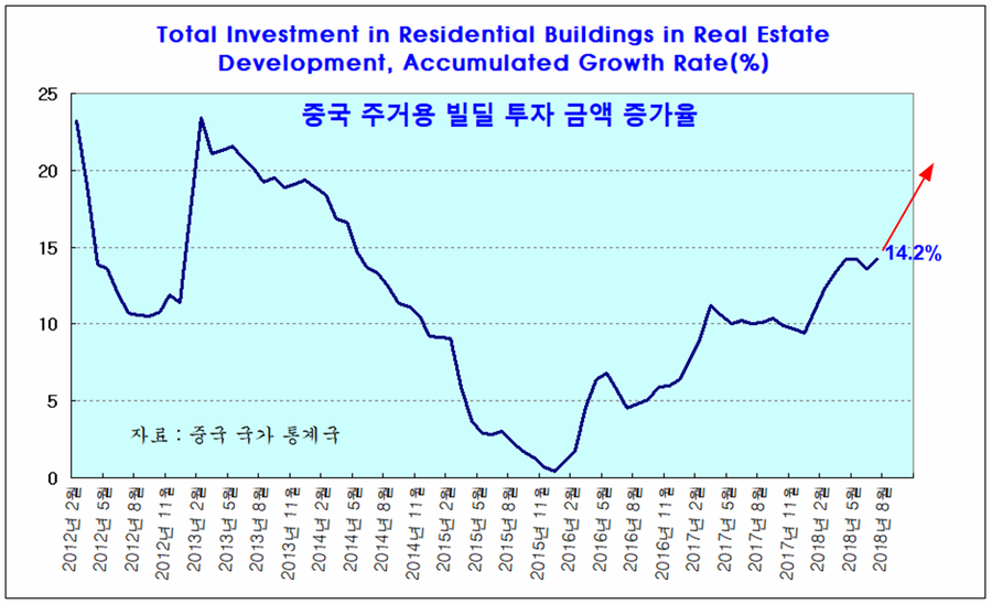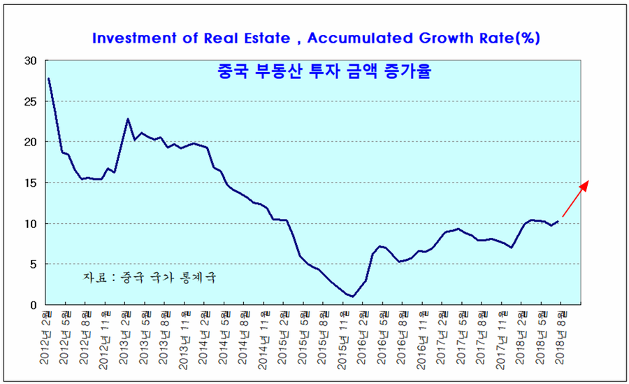 2018년 1~7월 중국의 고정자산 투자 증가율은 5.5%로 1~6월 고정자산 투자 증가율 6.0%에 비해 둔화 과정이 지속되고 있어 중국 경기에 대한 우려를 주고 있지만, 중국의 부동산 투자 증가율은 10.2%대 성장을 보이면서 2016년 12월 이후 시작된 회복 추세가 이어지고 있다.