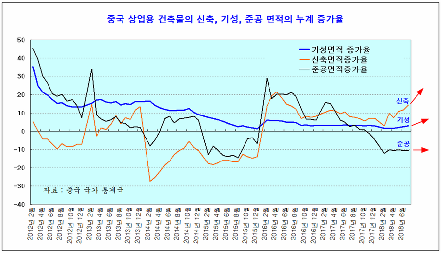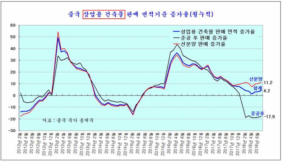 상업용 건축물의 1~7월 판매는 면적을 기준으로 4.2% 증가했지만, 준공 후 건축물 판매는 전년대비 17.9%가 감소한 반면, 선분양 거래는 11.2%의 증가를 나타낸다. 2017년 10월 이전에는 준공후 완성주택 판매가 선분양 주택 판매와 같은 비율 또는 보다 높은 증가율을 나타낸 반면, 2018년 들어 완성주택 판매가 줄고 선분양 주택 판매가 증가하는 현상이 뚜렷하다. 이것은 과거 신축의 감소로 준공 주택이 줄면서 주택을 건설하기 전에 선분양하는 주택을 구입하는 수요가 빠르게 늘고., 그만큼 주택 수급이 악화되고 있음을 의미한다.