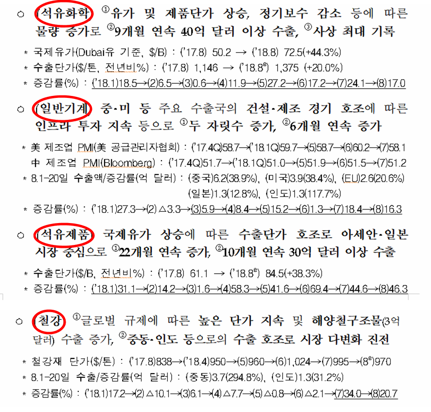쥬라기: 주요 수출 증가 업종으로는 석유제품(정유) 46.3%, 반도체 31.5%,