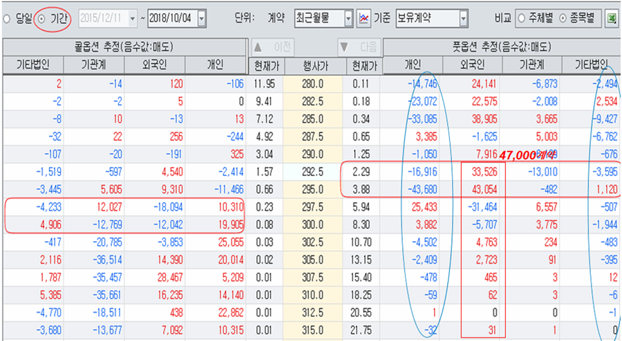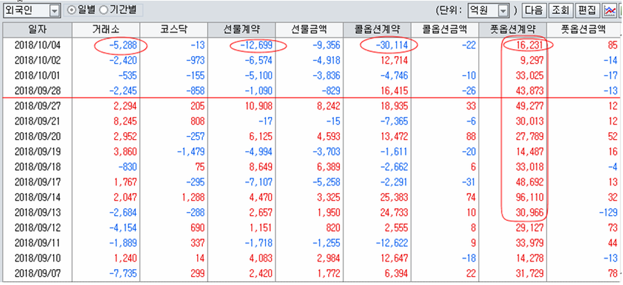 이 때문에 외국인의 하락을 겨냥한 매도 공세가 나타날 수 있어, 지수나 주가가 더 하락할 여지가 있다. 하락이 어디까지일지는 외국인이 풋옵션 47,000계약을 매수해두고 어디까지 하락시켜 이익을 얻을지를 계획하는 외국인의 마음이다.