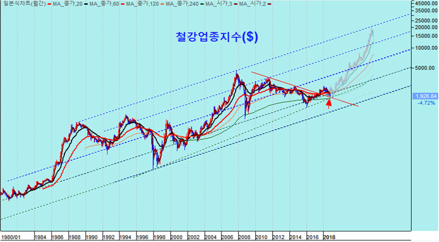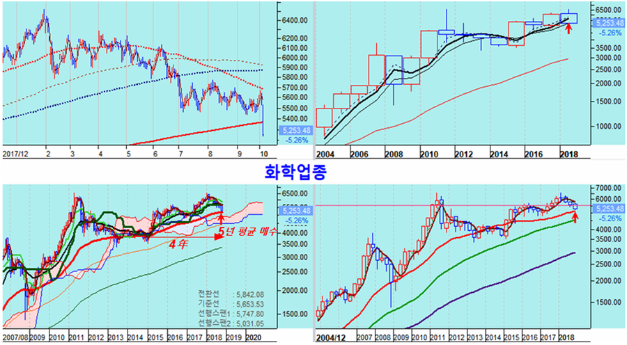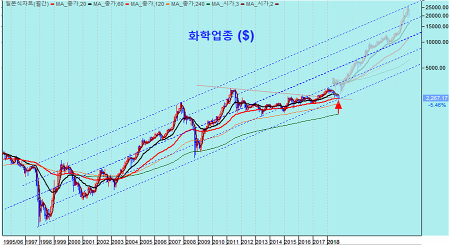 그러나 장기간 하락해 온 화학 주는 60월 평균의 성장 추세선 지지를 앞두고 급락함으로써 추세 반전의 전환점에 이른 듯 하다. 오늘 하락과 함께 화학업종지수는 원화와 달러 기준으로 월봉 60월 평균에 접하였다. 60월, 5년 평균선은 세계 경제가 회복되고 업황이 호전되면 쉽게 이탈하지 않고 상승한 연봉 5년 평균선으로 상승 중 조정은 대개 이 지수를 전후하여 추세가 반전되기 마련이다.