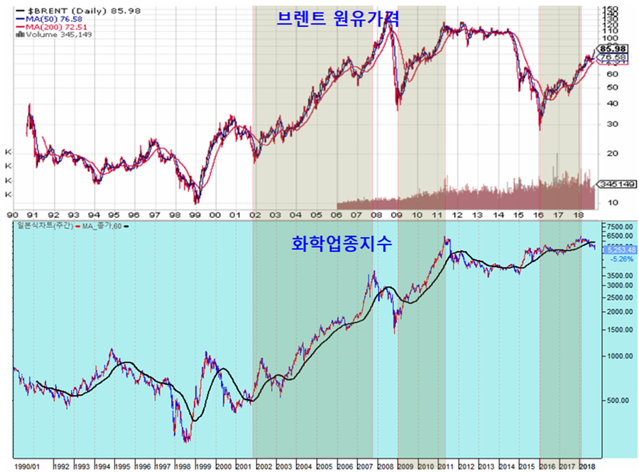 최근 애널리스트들은 원료인 원유가격의 상승을 이유로 기업의 실적 둔화를 예상하며 단기 실적 둔화를 예상하고 있다. 물론 유가 상승이 단기적으로 실적 둔화의 원인이 될지 모르지만 장기적으로는 유가 상승과 화학 업종 주가 상승은 함께 움직인다.