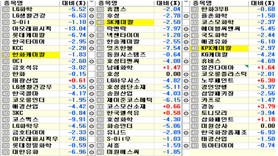 외국인과 기관의 화학 업종에 투매 수준의 대규모 매도를 함께 쏟으면서 화학주는 석유화학과 화장품 업종을 중심으로 큰 하락을 나타냈다.