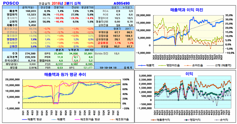 9월 이후 조정이 나타났던 세계 최고 경쟁력을 갖는 철강업체 POSCO는 연봉을 기준 시가3선 및 종가 5년 평균, 60월, 120월 평균가격에 이르렀다. 지난해 이후 비교적 가파르게 올랐던 이격 조정이 마무리된 모습이다.