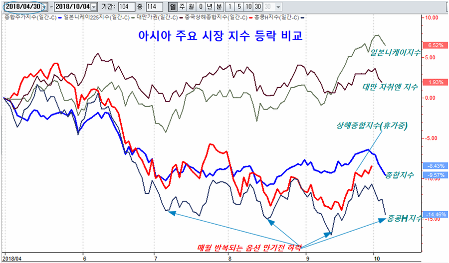 이 때문인 듯 올해 한국인이 설정한 ELS 때문에 옵션 포지션이 강한 홍콩 주가지수와 홍콩상장 중국지수 (홍콩H지수)와 함께 주가가 급락하는 모습을 보이고 있고, 이런 하락은 월례 행사가 되어 있다. 아시아의 많은 나라들과 신흥국의 여러 나라 중에서 유독 대규모 옵션 파생상품이 연관된 한국, 홍콩, 중국 증시의 변동이 가장 크게 나타나고 있다.