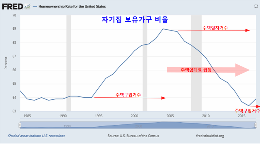 한편, 가구의 주택보유 비율을 보면 1994년까지 64%에 머물던 자가보유율이 부동산 경기와 함께 2005년 69%까지 상승을 하였으나, 주택가격 상승에 따른 주택임차거주 선호로 인해 2016년까지 63% 초반까지 하락함으로써 자기집 보유 비율은 1980년 이후 가장 낮은 수준이 되었다.