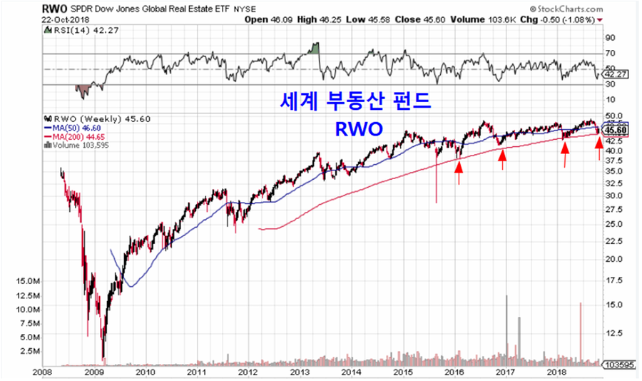 아울러 세계의 부동산 펀드도 대부분 연중 저가의 매수권에 진입한 것으로 보인다. 세계 각국 부동산 투자를 대상으로 하는 세계 부동산 펀드 RWO도 연중 저가 매수권에 있다.