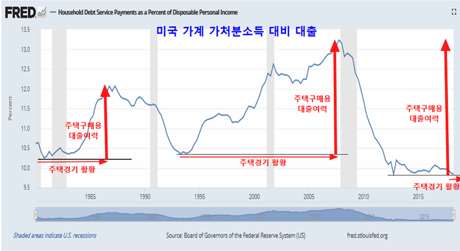 현재 미국 가구의 부채원리금 부담 비율을 보면 9.8%로 과거에 비해 매우 안정적이다. 1990년초 10.4%의 부채원리금 부담비율이 주택경기 호전과 함께 대출이 늘면서 2008년 13.2%로 늘어나는 동안 장기간 주택경기가 활황이 되었다. 따라서 13% 수준까지 미국 가계가 부채원리금 부담 비율을 확대할 수 있다고 볼 때 현재 9.8%의 부담률은 향후 3.2% 정도 증가할 때까지 대출증가와 함께 주택구입을 늘릴 수 있는 여력이 있고 이런 여력은 1990년부터 2007년에 걸친 장기 주택 경기보다 더 강력한 주택경기가 회복될 환경이다.