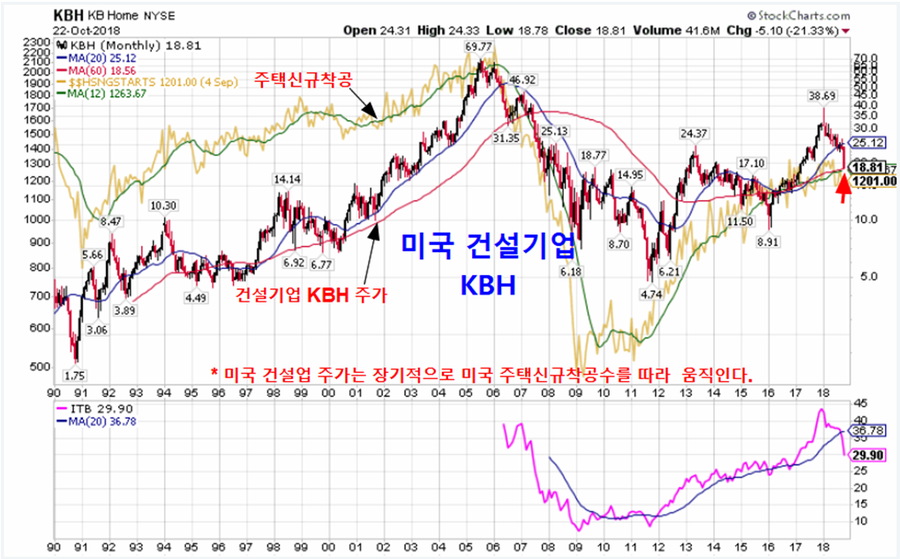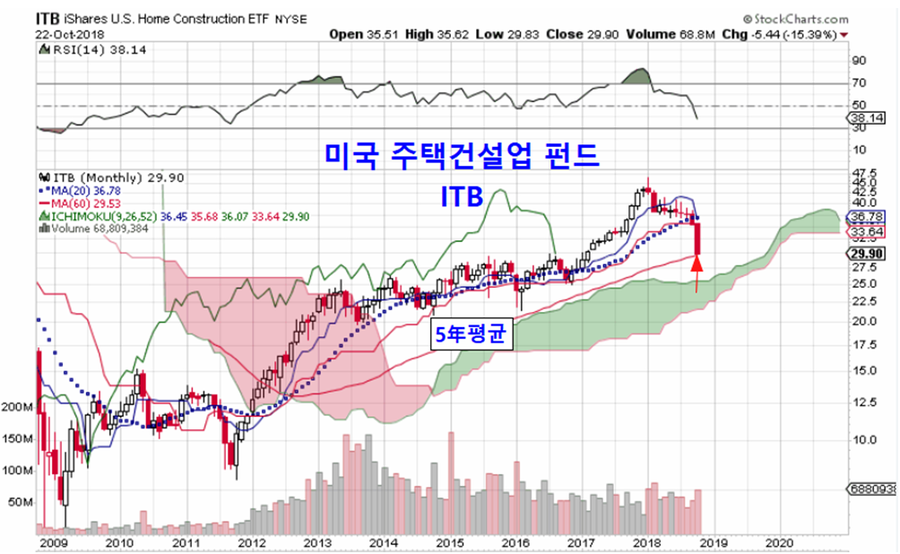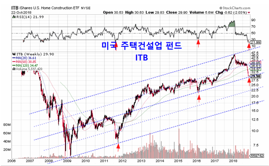 2018년 들어 하락 조정을 거치던 미국 건설업 펀드 ITB는 10월 이후 이례적인 급락을 한 가운데 60월(5년)평균에 이르렀다. 5년의 기간을 나타내는 60월 평균은 장기 성장하는 추세의 지지권으로 장기 성장이 이어지는 시세의 경우 대개 이 가격을 기준으로 조정이 마무리 되어 상승하기 쉽다.