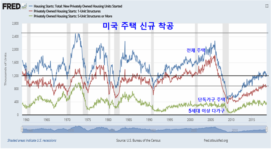 이런 점에서 미국 주택착공이 꾸준한 상승세를 보이고 있고, 그 수준은 아직도 과거 주택 침체기의 착공 수준을 벗어나지 않았다.