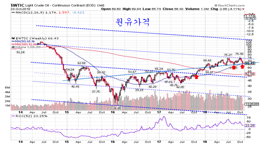 지수가 급락했던 2월과 10월 하락 국면에서 원유가격과 엑슨모빌 주가가 평소와 다른 급락을 보여주고 있다. 즉, 원유가격 변동과 석유기업 엑슨모빌의 주가 움직임은 뉴욕종합주가지수의 움직임에 주요한 영향을 주고 있다. 이 하락을 만든 원유가격도 중요한 지지권에 진입하여 있다.