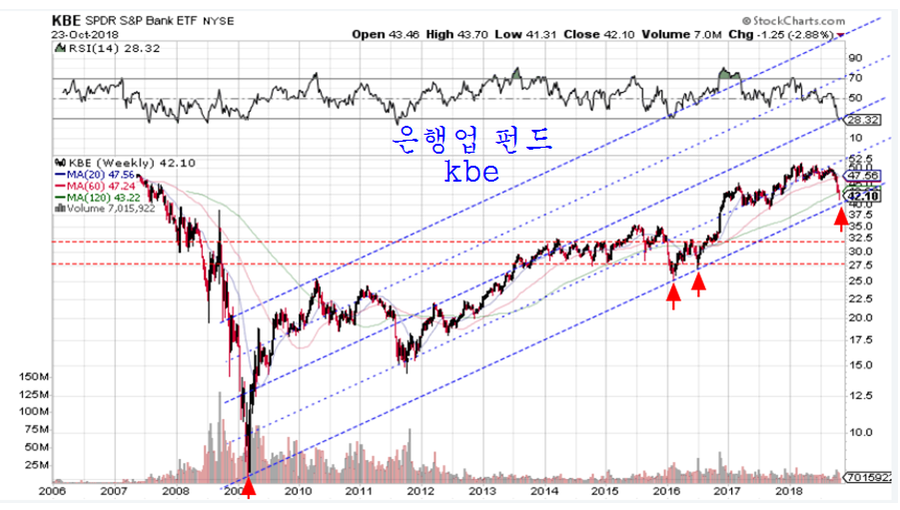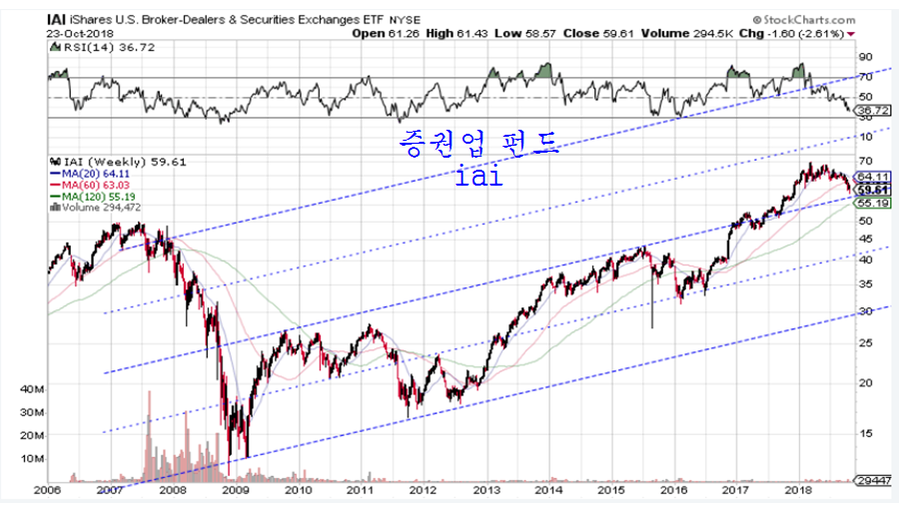 이와 함께 미국의 은행주 펀드 KBE와 증권주 펀드 IAI가 추세 전환의 변곡점에 접근한 듯 하다.