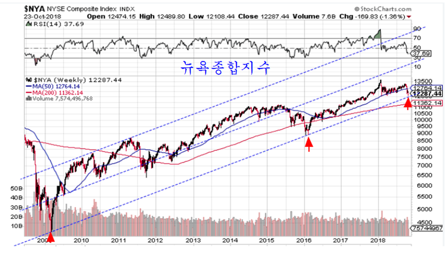 미국의 트로이카의 전환점 진입과 함께 뉴욕 종합주가지수도 장기추세 채널의 하단에 진입했다.