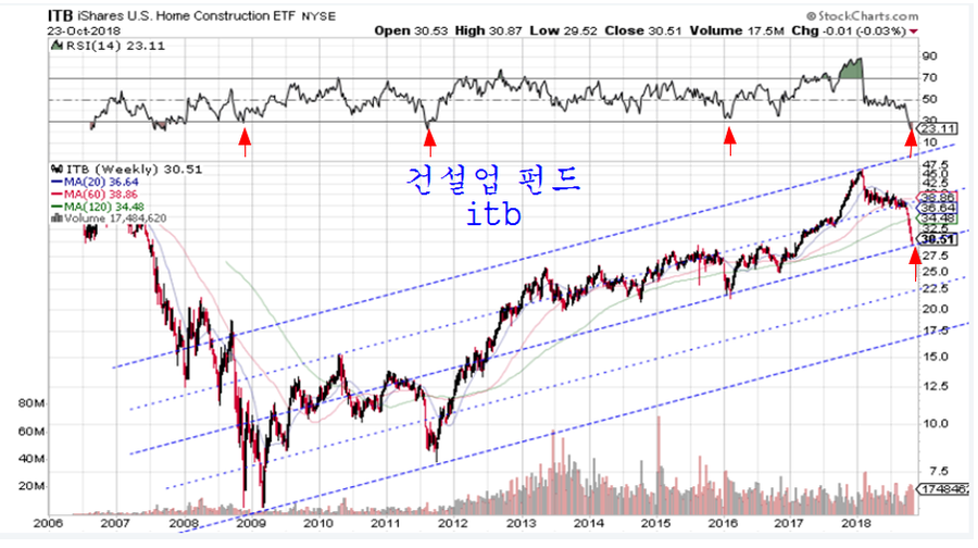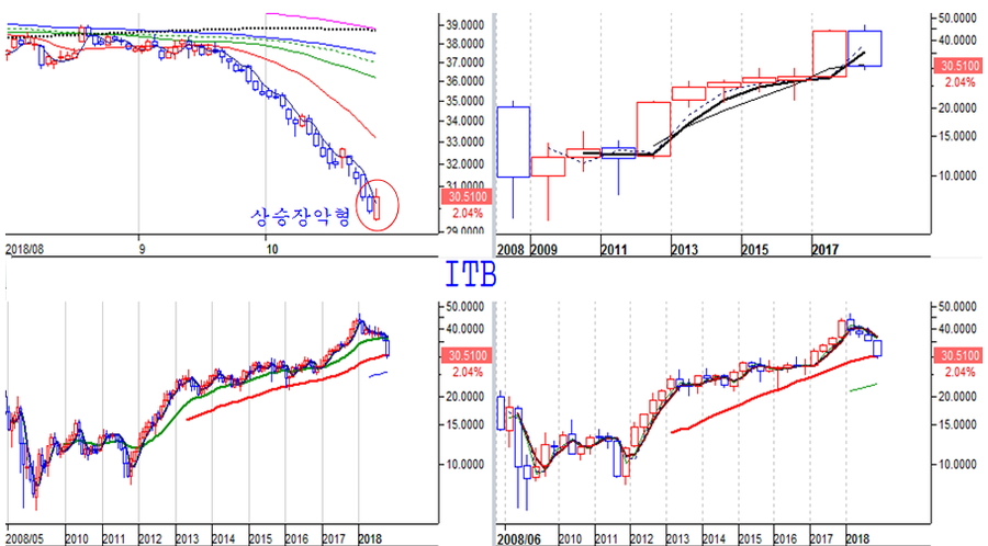 그간 급락이 이어졌던 미국 건설업 펀드 ITB는 23일 하락으로 출발한 후 전일 고점을 넘어 상승을 거쳐 마감함으로써 상승 장악형 패턴을 만들고 있다.