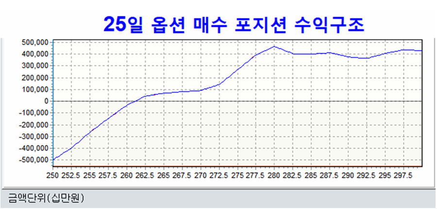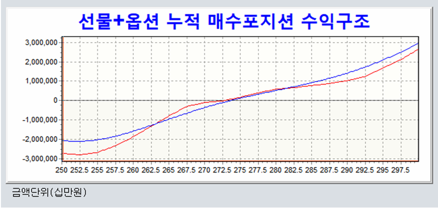 하루 포지션치고는 대단히 강력한 롱포지션이 구축된 셈이다. 또한 선물과 옵션포지션 누계 포지션의 합산 수익구조는 아래와 같으며 가장 공격적인 형태의 매수 포지션이 되어 있다.