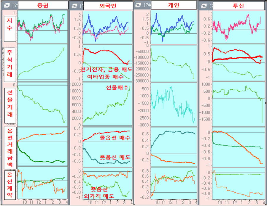 선물, 옵션, 공매도, 레버리지와 인버스 ETF, ELS, 양매도 ETN 등 파생상품 투기만 발달한 시장에서 외국인을 마음껏 지수를 흔들어 초저가 바겐세일로 상승을 준비한 하루이다.