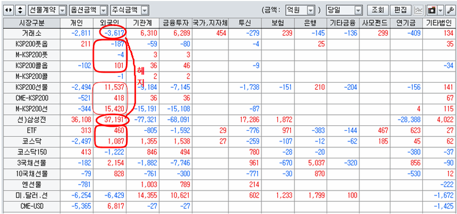 따라서 오늘 시장은 주가의 상승 전환을 앞두고 외국인이 선물과 옵션의 롱포지션을 대규모로 구축하기 위해 삼성전자를 팔아(삼성전자 종목선물로 매도헤지) 지수를 크게 낮추는 장세라고 보면 좋다.