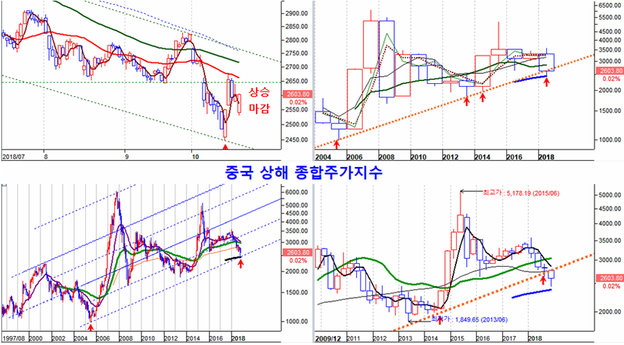 다음은 세계 주요 지수와 주요 펀드의 장기 추세 구도와 현재의 위치이다. 전세계 증시가 가지런히 하락을 마무리하고 상승을 준비해 둔 모습이다.