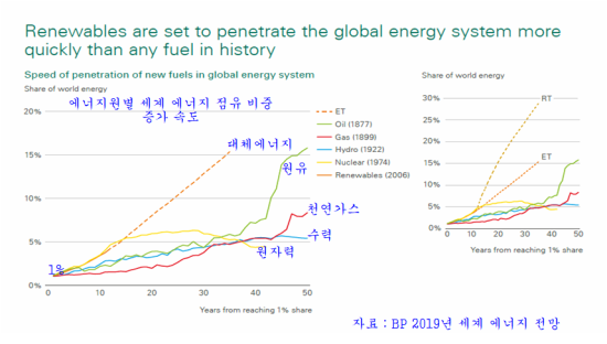 다음은 영국석유 BP의 2019년 에너지 전망의 자료이다. 인류가 에너지로 이용해 온, 석탄, 가스, 원유, 수력, 원자력, 그리고 대체에너지가 전세계 에너지 점유율 1%를 차지한 시점부터 점유율 증가속도를 비교한 자료이다.