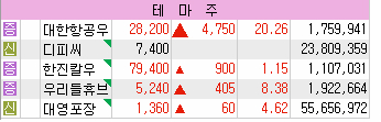 테마 종목군으로는 한진그룹 경영권 분쟁 본격화에 따라 대한항공 우선주, 한진칼 우선주 등 다소 시총이 적은 종목들이 치고 나가고 있고 본주들이 그 뒤를 따라 붙는 모습이다.