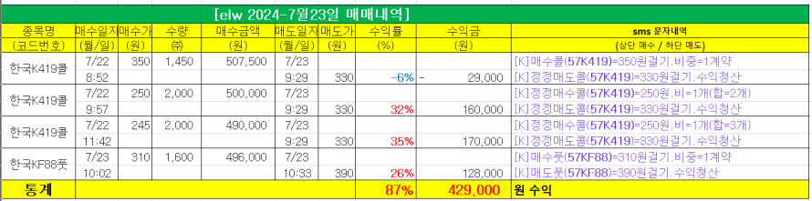 23일(화) elw 매매에서는 당일 단타 매매로 87% 수익을 챙겼습니다.