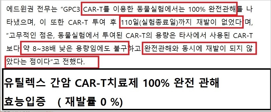 유틸렉스 기적의항암제 "고형암CAR-T,암세포 100%사멸 효증입증