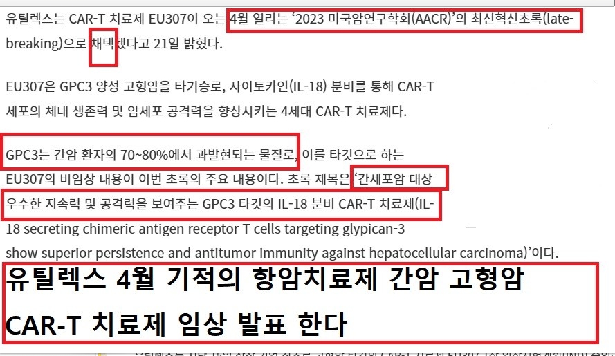 [핫이슈 일정 ]유틸렉스 상장사 최초 4월 14일 기적의항암제"고형암CAR-T치료제 100%완전관해 발표한다
