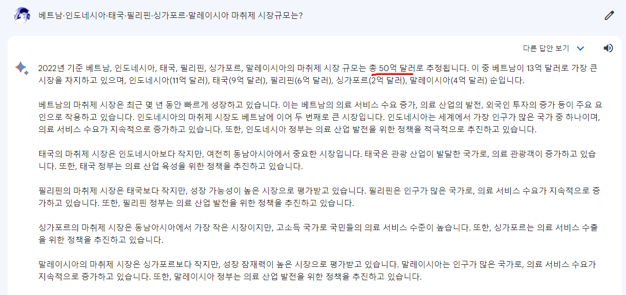 오늘 좀 시간이 남아서 하나제약 수출국인 동남아시아 시장규모를 구글 바드에게 불어 봤습니다.