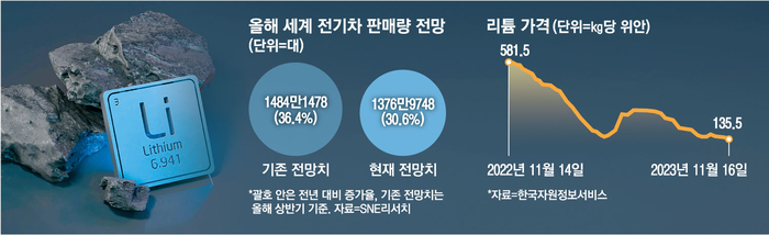 배터리 핵심 소재인 리튬 가격이 2년 만에 최저치로 떨어진 것으로 나타났다. 여기에 전기차 성장률도 하향 조정되며 배터리 업계의 다운사이클이 최소 내년 1분기까지 이어질 것이라는 전망이 나온다.
