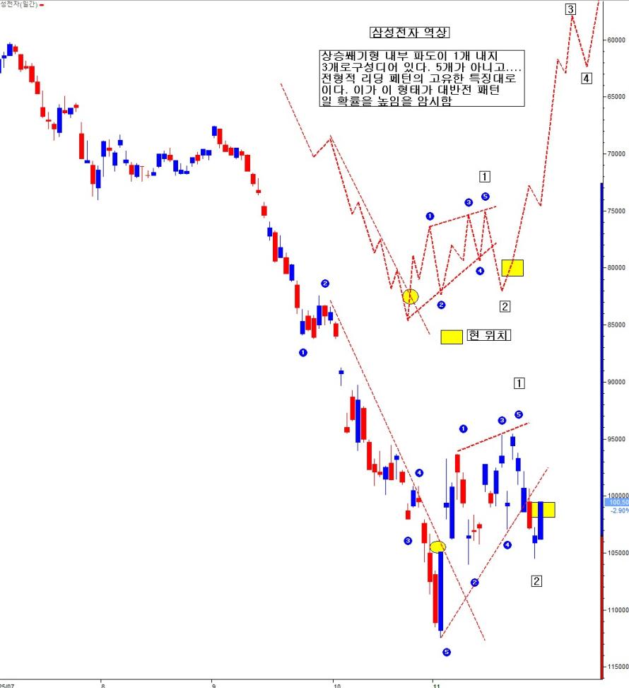 역상으로 보면, 바닥권에서 대반전 패턴인 리딩다이아고날 패턴일 수 있음을 암시한다. 삼성전자와 묘하게도 동일 형태 같다.