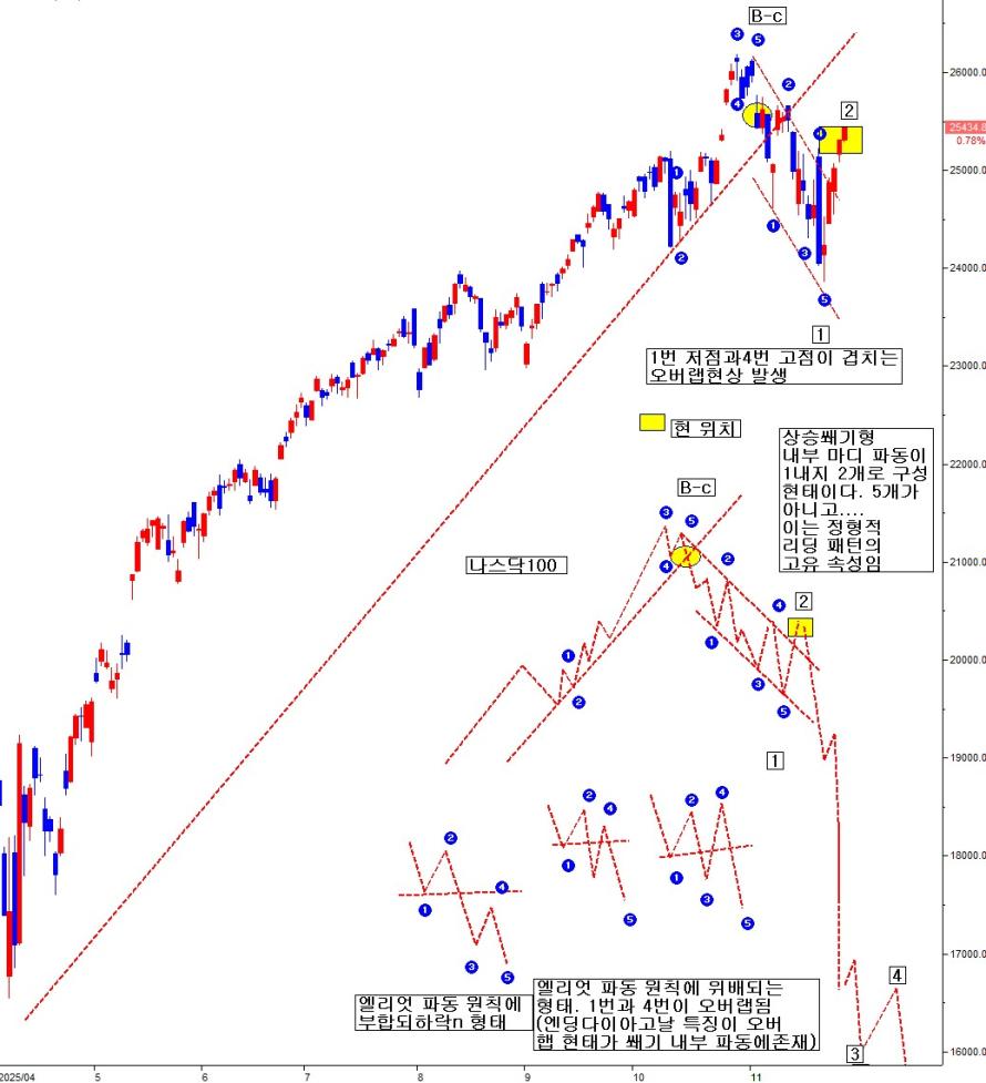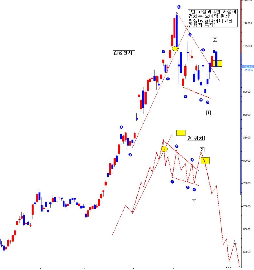 지금 현재 삼성전자 나스닥100 코스피 일봉 상 모두 공통적으로 상승쐐기형 내부 마디 파동이 1내지 3개로 구성된 형태이다. 5개가 아니고.... 이는 정형적 리딩다이아고날 패턴의 고유 속성이다. 내부 파동이 5-3-5-3-5 경우도 가능하며, 일반적 형태는 3-3-3-3-3경우이다. 그러나 실전에서 이런 교과서적 형태 보다는 내부 파동이 1개로 단순하게 나오거나 3 혹은 5가 혼재된 등의 변형이 더 빈번하다. 이 패턴의 또 다른 특징은 상승쐐기형 내부 파동이 엘리엇 파동 원칙을 따르지 않는다는 점이다. 즉, 하락n의 12345가 겹치지 말아야 하는데 겹치는 형태(1번 4번이 오버랩)를 띤다는 것이다. 지금 현재도 나스닥과 코스피200 및 삼전이 일봉 상 쐐기 내부 파동의 overlap(1번과 4번이 겹침)현상이 발생한 상태이다.