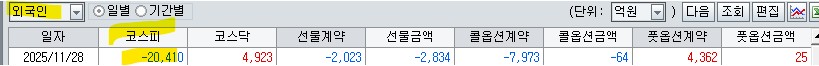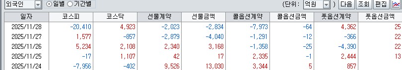 11월 마지막 날 미국은 상승 한국은 하락 마감하였다. 미제 무관 4주 연속 한국은 금요일 마다 장대 음봉이 생기는 현상 반복 중이다. 특히 금주 금요일의 경우, 미국 휴장임에도 한국 증시 홀로 급락하였다. 다른 요인은 무시하고 단지 메이저 수급 측면에서 강력한 현물 매도세 탓이다. 현물 양이는 금요일만 되면, 삼전 하닉 위주로 초대량 매도를 반복하고 있다. 특히 금주 금요일의 경우, 이전 3주간 금요일과 달리 삼전 하닉만이 아니라, 업종 전반에 추가적 대량 매도세였다. 무언가 현물 양이는 한국 증시가 천정이라 보고 있는 듯한 태도를 보이고 있다. 금요일 같은 상황에 누가 장대 음봉으로 폭락한다고 생각을 하겠는가? 그런데 그런 일이 생겨버렸다. 무언가 한국호에 균열이 생기고 있다는 증거 중 하나이다. 그럼 최근 3주간 매주 월요일마다 장대 양봉 불기둥이 생겼으니 차주도 그럴 것인가? 금 밤 미국 상승으로 월요일 상승 반복할 것 같지만, 분석자가 보기에 차주는 그러지 않을 것 같다.