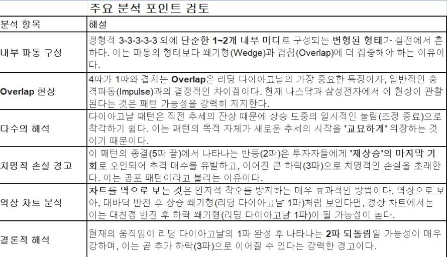 리딩 다이아고날(Leading Diagonal) 패턴의 핵심적인 특징과 실전에서의 심리적 함정을 요약하면 아래와 같다.