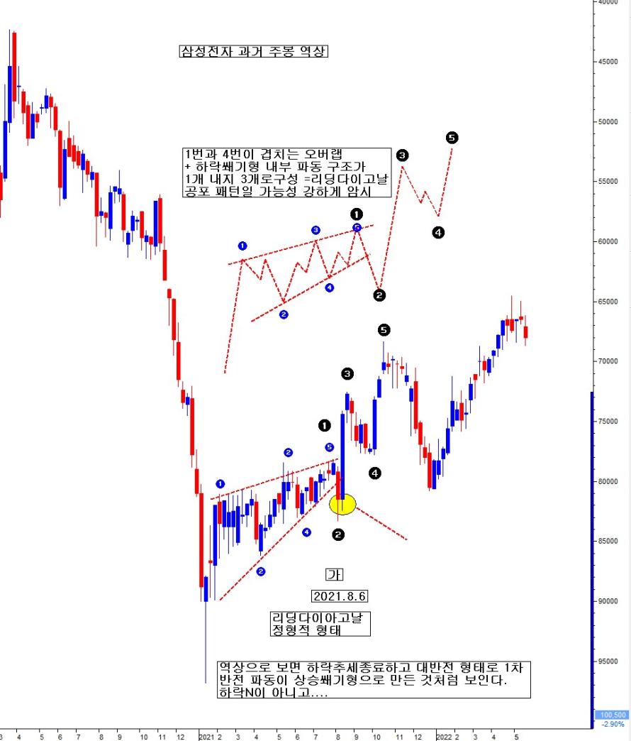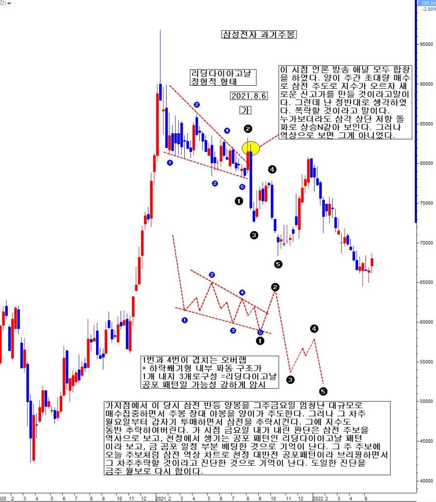 가 지점에서 이 당시 삼전 반등 양봉을 그 주 금요일 엄청난 대규모로 매수 집중하면서 주봉 장대 양봉을 양이가 주도한다. 그러나 그 차주 월요일부터 갑자기 투매하면서 삼전을 추락시킨다. 그에 지수도 동반 추락하여 버린다. 가 시점 금요일 그 당시 내가 내린 판단은 삼전 주봉을 역상으로 보고, 천정에서 생기는 공포 패턴인 리딩다이아고날 패턴이라 보고, 금 지수와 삼전 곰포 일정 부분 베팅한 것으로 기억이 난다. 그 주 주보에 오늘 월보처럼 삼전 역상 차트로 천정 대반전 공포 패턴이라고 브리핑하면서, 그 차주 추락할 것이라고 진단한 것으로 기억이 난다. 동일한 진단을 금주 월보로 다시 함이다.