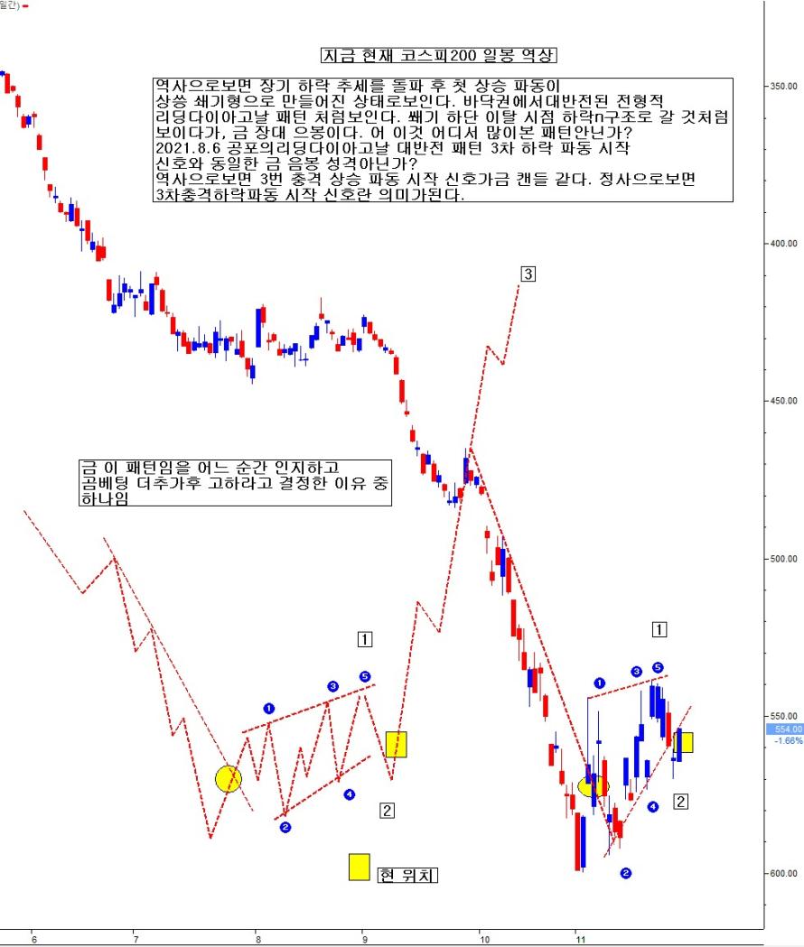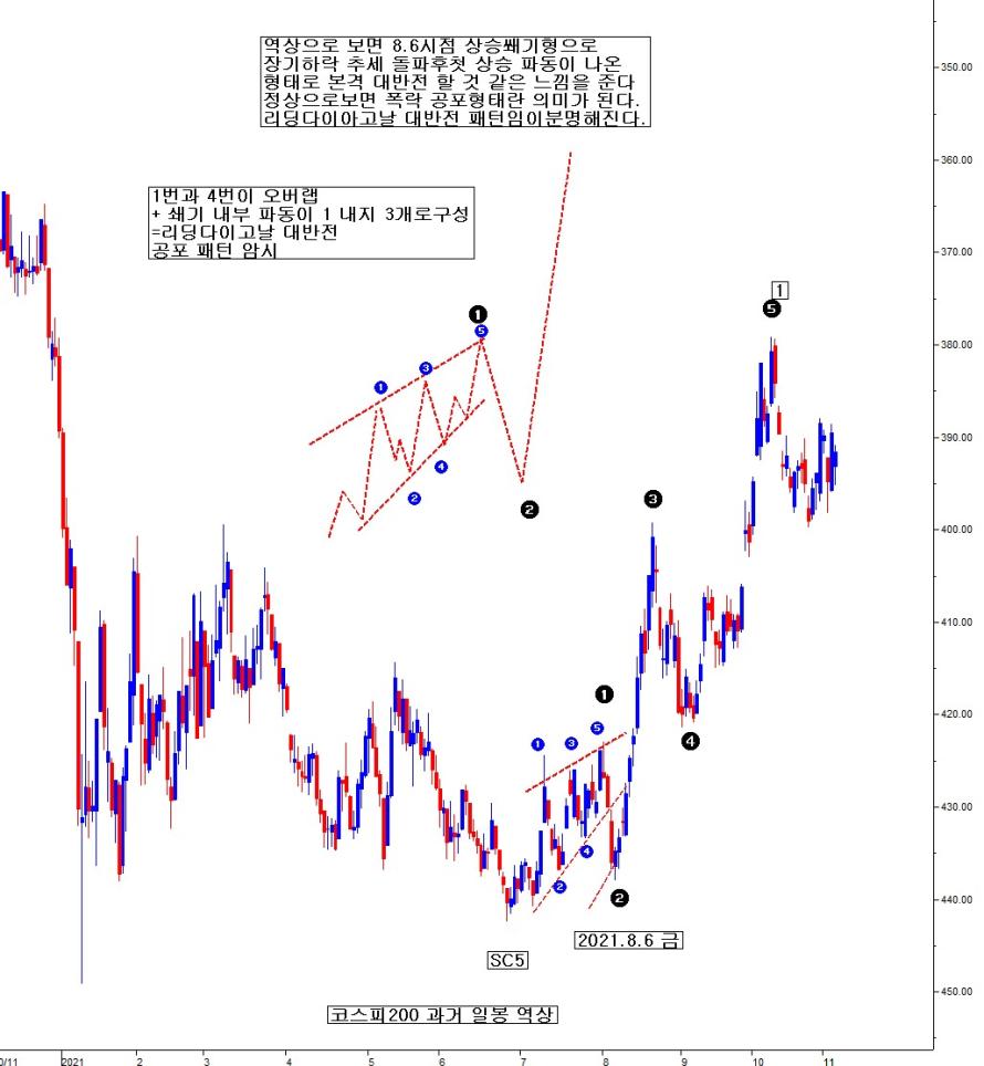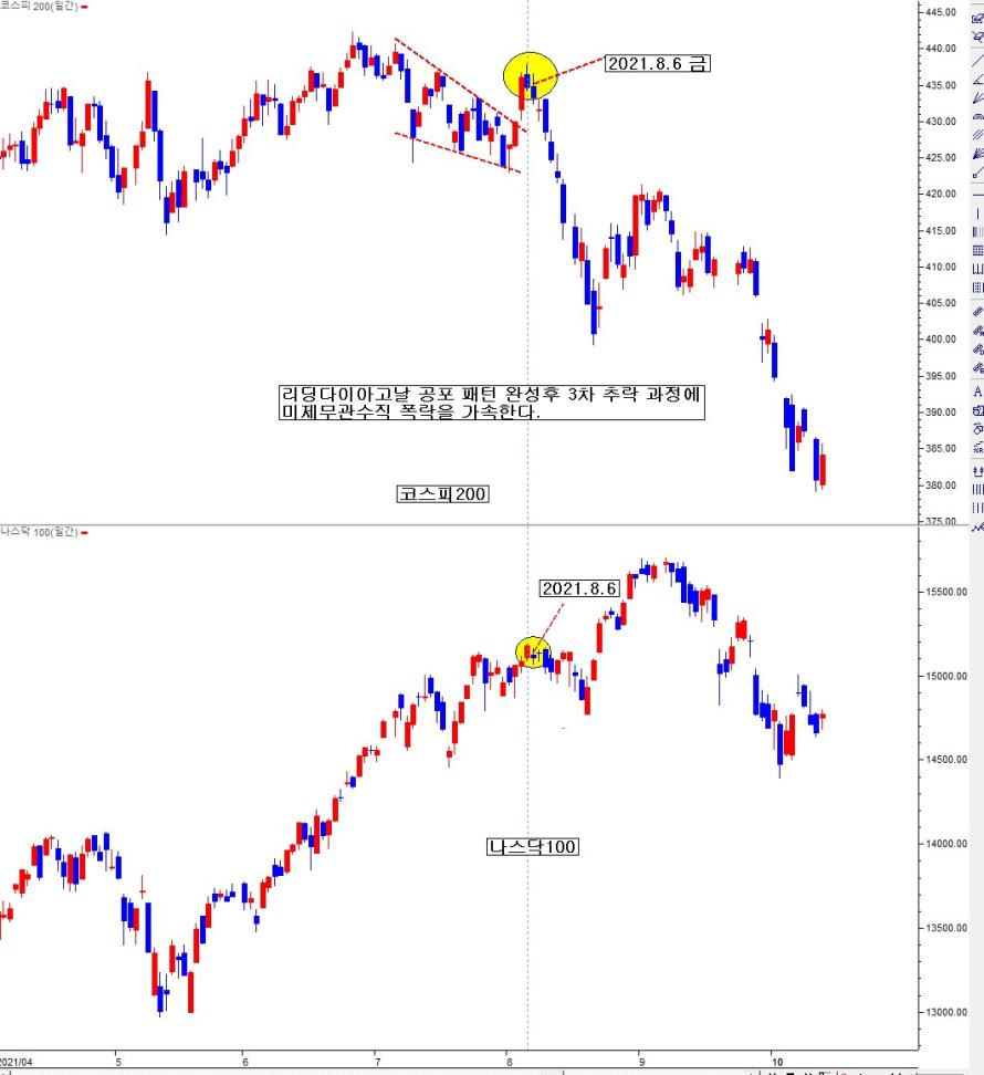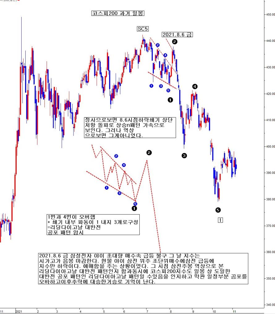 정상으로 보면, 8.6 시점 하락 쐐기 상단 저항 돌파로 상승n패턴 가속으로 보인다. 그러나 역상으로 보면, 그게 아니었다. 2021.8.6 금 삼성전자 양이 초대량 매수 속 급등 불구, 그 날 지수는 시가 고가 음봉 마감한다. 현물 양이 삼전 위주 조 단위 매수에 삼전 급등에 지수만 하락이다. 애매함을 주는 상황이었다. 그 시점 삼전 주봉 역상으로 본 리딩다이아고날 대반전 패턴 인지 함과 동시에 코스피200지수도 일봉 상 동일한 대반전 공포 패턴인 리딩다이아고날 패턴일 수 있음을 인지하고, 막판 일정 부분 곰포를 오바하고, 이후 추락 파동에 대승한 것으로 기억이 난다. 이런 L.D.P 공포 패턴이 확정되고 무너지는 초입에는 미 증시 연동하여 시황을 판단하면, 크게 화를 부른다. 미국은 무시하고 우리 자체 수급 가격 흐름을 보고, 시황 판단함이 더 적절하다. 지금 현재도 그런 상태일 확률이 높다.
