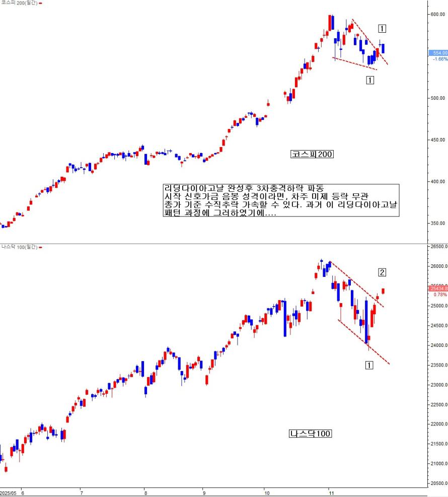 지금 현재 코스피200 및 나스닥 100 지수와 삼성전자 일봉을 보면, 리딩 다이아고날의 형태적 특징(쐐기형, Overlap)을 보이고 있으며, 대반전 패턴일 가능성이 높다고 할 수 있다. 현재 다수가 '상승 재 시작'으로 보는 시점은, 오히려 리딩 다이아고날의 2파 반등의 고점일 수 있다는 관점에서 한미 모두 현가에서 더 오른다고 매수할 때가 아니며, 고점 매도 기회를 모색하는 것이 현명한 태도이다. 이런 L.D.P 공포 패턴이 확정되고 무너지는 초입에는, 미 증시 연동하여 시황을 판단하면, 크게 화를 부른다. 미국은 무시하고, 우리 자체 수급 가격 흐름을 보고, 시황 판단함이 더 적절하다. 지금 현재도 그런 상태일 확률이 높다.