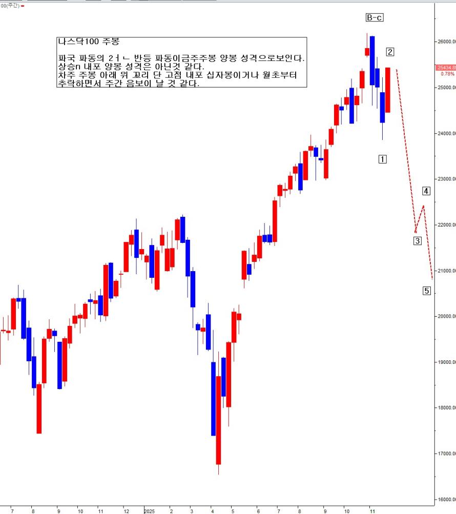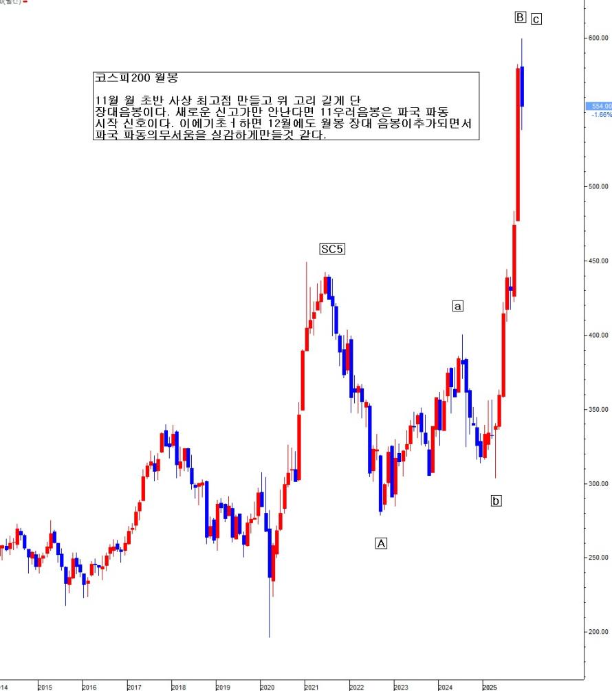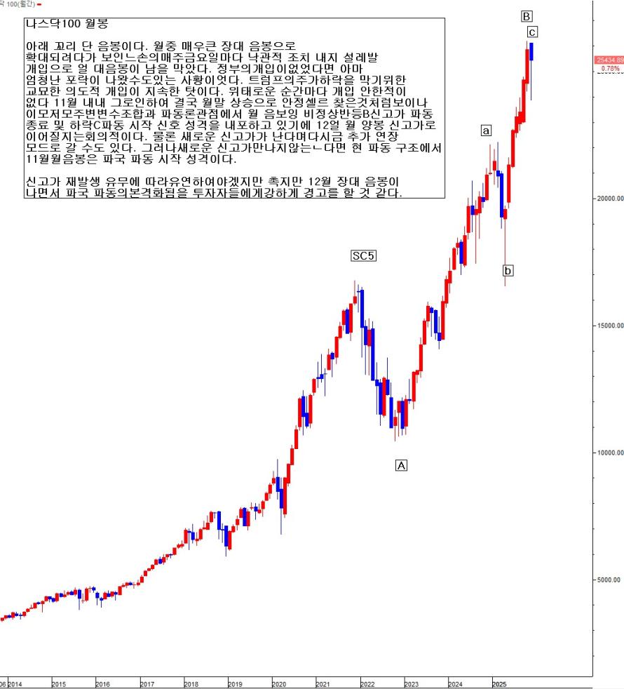 아래 꼬리 단 음봉이다. 월 중 매우 큰 장대 음봉으로 확대되려다가, 보이는 손의 매주 금요일마다 낙관적 조치 내지 설레발 개입으로 월 대음봉이 남을 막았다. 정부의 개입이 없었다면, 아마 엄청난 폭락이 나왔을 수도 있는 상황이었다. 트럼프의 주가 하락을 막기위한 교묘한 의도적 개입을 지속한 탓이다. 위태로운 순간마다 개입 안한 적이 없다. 11월 내내 그로 인하여 결국 월 마지막 주 내내 상승으로 안정세를 찾은 것처럼 보이나, 이모 저모 주변 변수 조합과 파동론 관점에서 11월 월 음봉이 비정상반등B신고가 파동 종료 및 하락C파동 시작 신호 성격을 내포하고 있기에, 12월 월 양봉 신고가로 이어질지는 회의적이다. 물론 새로운 신고가가 난다면, 다시금 추가 연장 모드로 갈 수도 있다. 그러나 새로운 신고가만 나지 않는다면, 현 파동 구조에서 11월 월 음봉은 파국 파동 시작 성격이다.